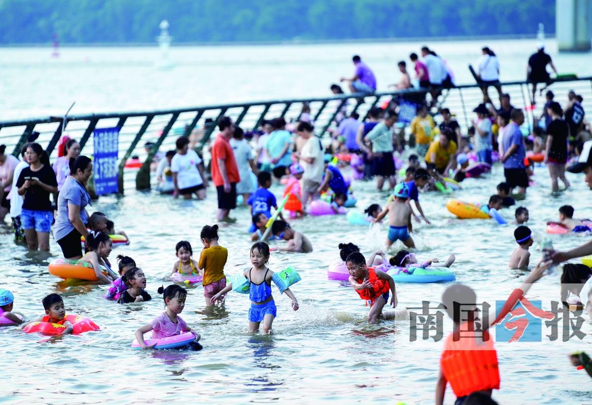 7月24日晚7時,在柳州市濱江西路人工沙灘,不少市民帶小孩過來戲水消暑。他們都做好防護(hù)措施,而一旁,也有志愿者在“盯”著,以防意外。記者 顏篁 攝(廣西新聞網(wǎng)-南國今報)