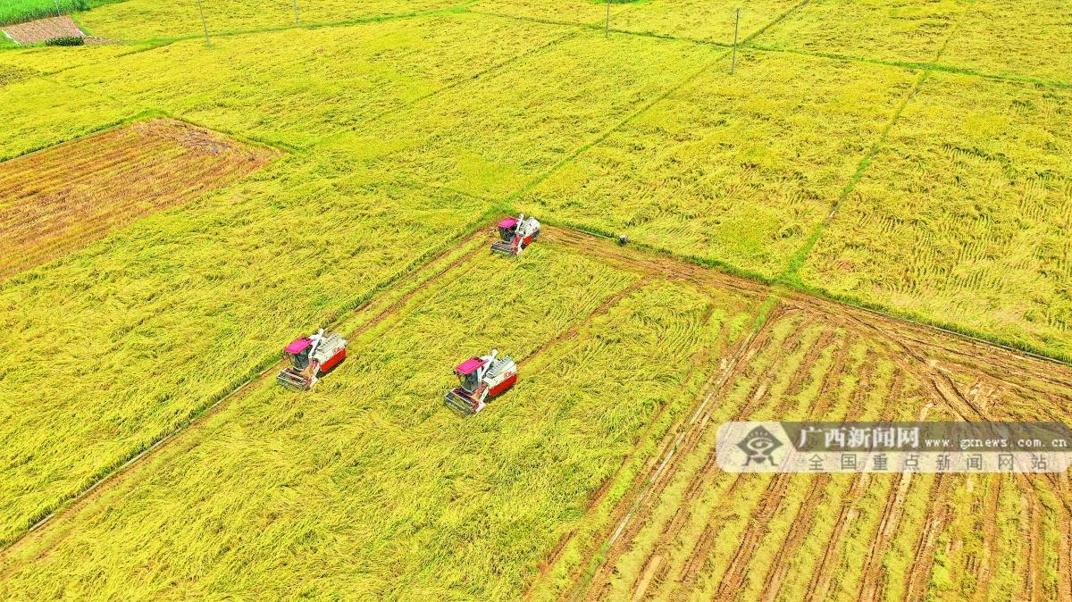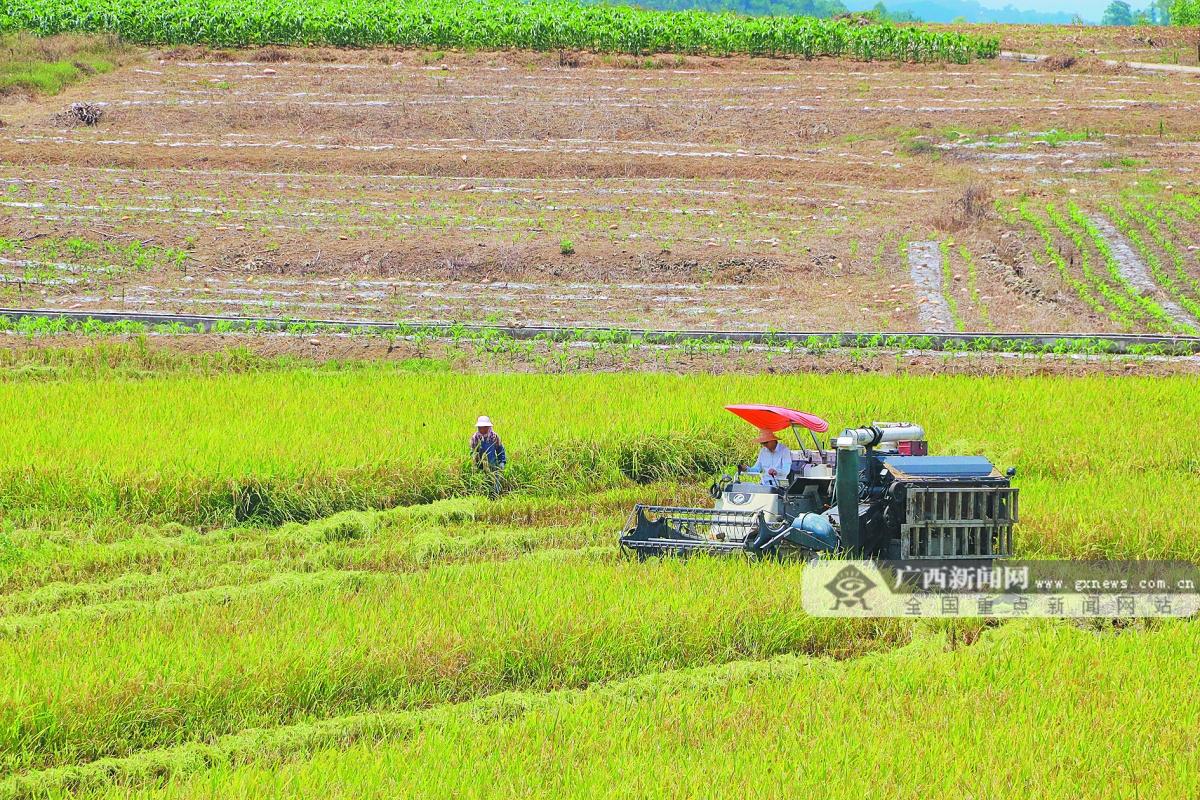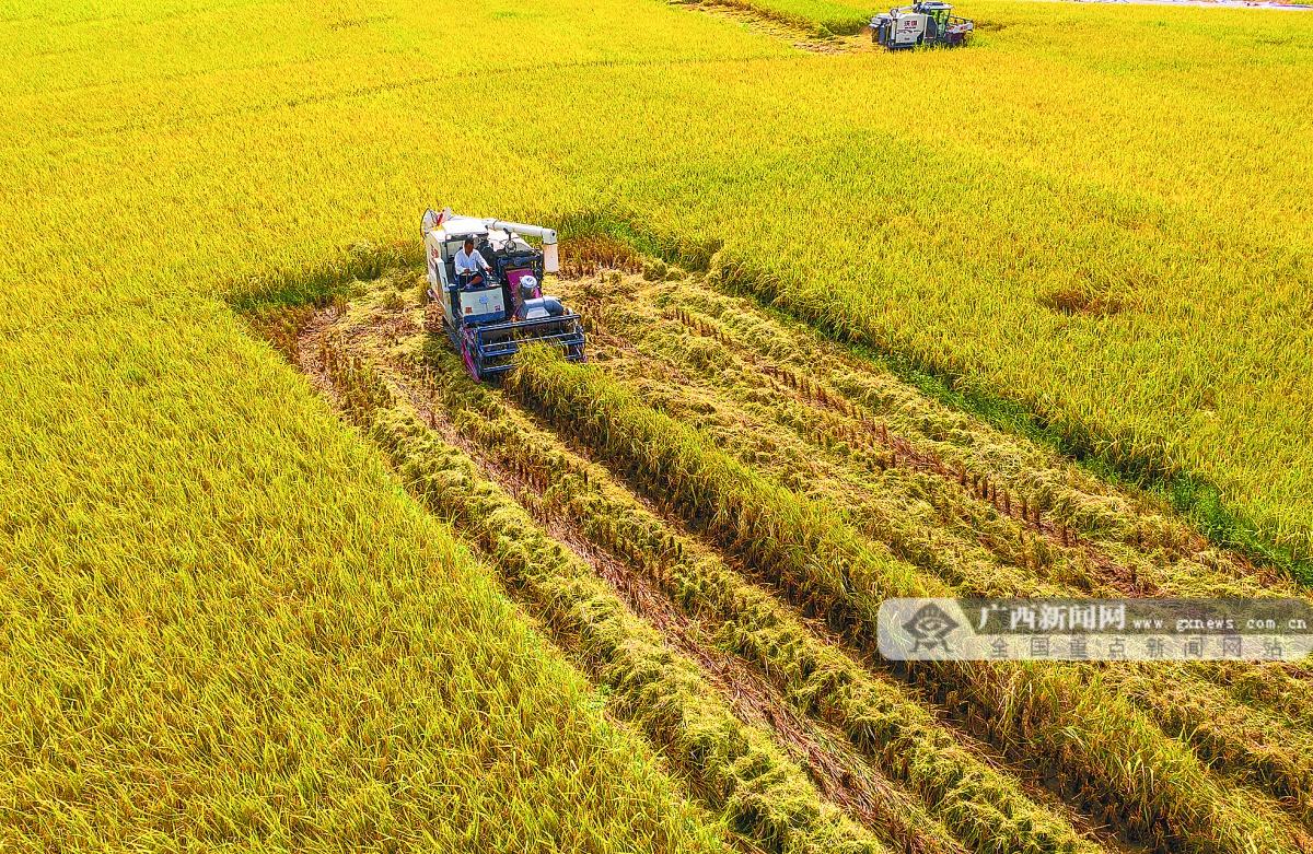 連日來,南寧市各地農(nóng)民趁著晴好天氣搶收稻谷。圖為在隆安縣雁江鎮(zhèn)的水稻種植基地里,金黃色的稻穗在收割機(jī)的運作下變成整齊的稻茬。記者 沈程 覃海明 通訊員 盧虹靈 攝(廣西新聞網(wǎng)-廣西日報)
