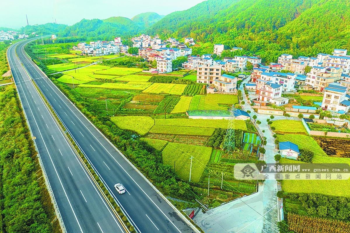 7月25日,在蒙山縣文圩鎮(zhèn)大明村燈掛屯,整潔的村莊與村前的高速公路、金黃的稻谷互相映襯,構(gòu)成一幅美麗的鄉(xiāng)村畫卷。近年來,該縣大力推進(jìn)美麗鄉(xiāng)村建設(shè),助力鄉(xiāng)村振興。黃勝林 攝(廣西新聞網(wǎng)-廣西日報)