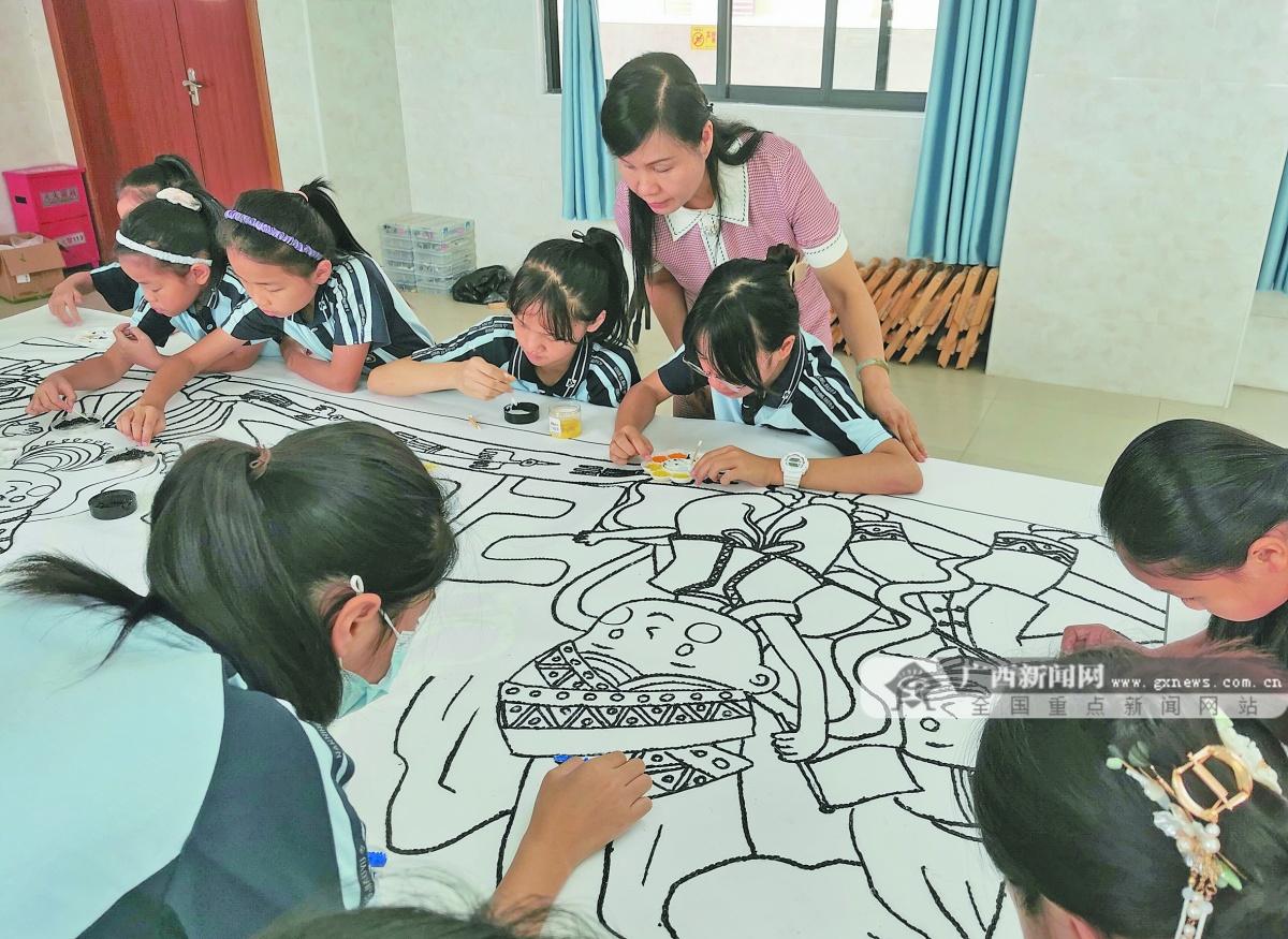 連日來,南寧市邕寧區(qū)清泉小學(xué)組織學(xué)生利用暑假制作一幅長2.4米、寬1.2米的大型點米畫。該畫作將參加第26屆南寧國際學(xué)生用品交易會暨2022中國·東盟(南寧)國際教育展覽會的相關(guān)展示交流活動。滕忠 攝(廣西新聞網(wǎng)-廣西日報)