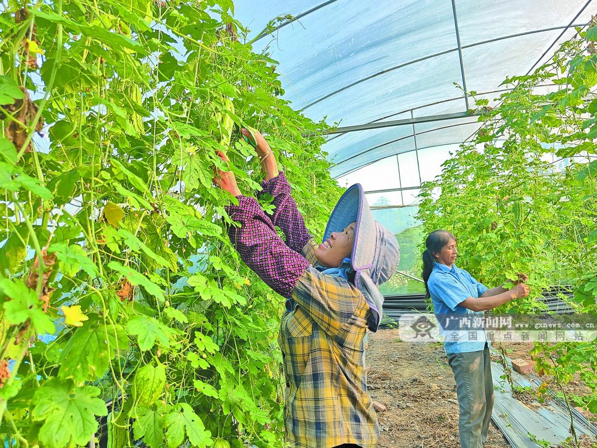 7月22日,在南寧市興寧區(qū)五塘鎮(zhèn)西龍村壇白坡村一處農(nóng)業(yè)基地,村民正在采摘苦瓜。據(jù)悉,今年五塘春種苦瓜1.35萬畝,產(chǎn)量達(dá)4.5萬噸,產(chǎn)值達(dá)1.8億元,帶動全鎮(zhèn)8000多人增收。記者 巫美橋紅 攝 (廣西新聞網(wǎng)-廣西日報)
