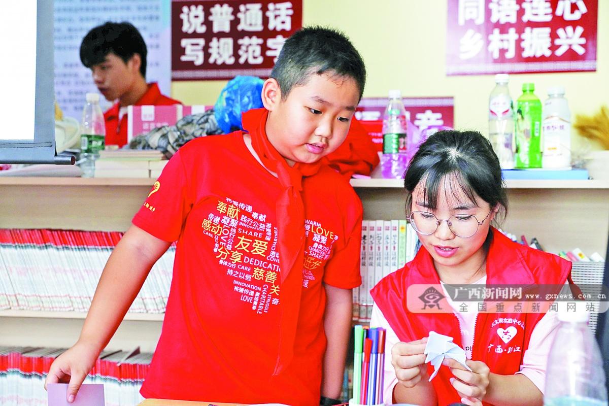 放暑假以來,河池市各縣區(qū)依托新時代文明實踐中心,組建包括學(xué)校教師、社會志愿團(tuán)體、志愿者、大學(xué)生和民間藝人等在內(nèi)的輔導(dǎo)員隊伍,利用現(xiàn)有場地設(shè)施條件,切實服務(wù)農(nóng)村未成年人,讓孩子們度過一個充實快樂的假期。圖為環(huán)江毛南家園城北移民安置區(qū)小朋友們在學(xué)習(xí)手工。記者 廖慶凌 通訊員 牙美瑩 梁紹恩 譚麗珊 攝(廣西新聞網(wǎng)-廣西日報)