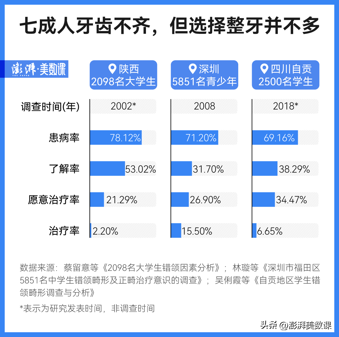 調(diào)節(jié)費用昂貴,一直以來都是制約人們采取正畸調(diào)節(jié)的主要原因之一。在 2006 年,一項對重慶市 2474 名高中生的調(diào)查中,有錯頜畸形卻沒去調(diào)節(jié)的人里,有四分之一的人是因為受限于經(jīng)濟(jì)條件。這也是為什么多項調(diào)查結(jié)果都顯示,城市青少年的正畸調(diào)節(jié)率要高于農(nóng)村。