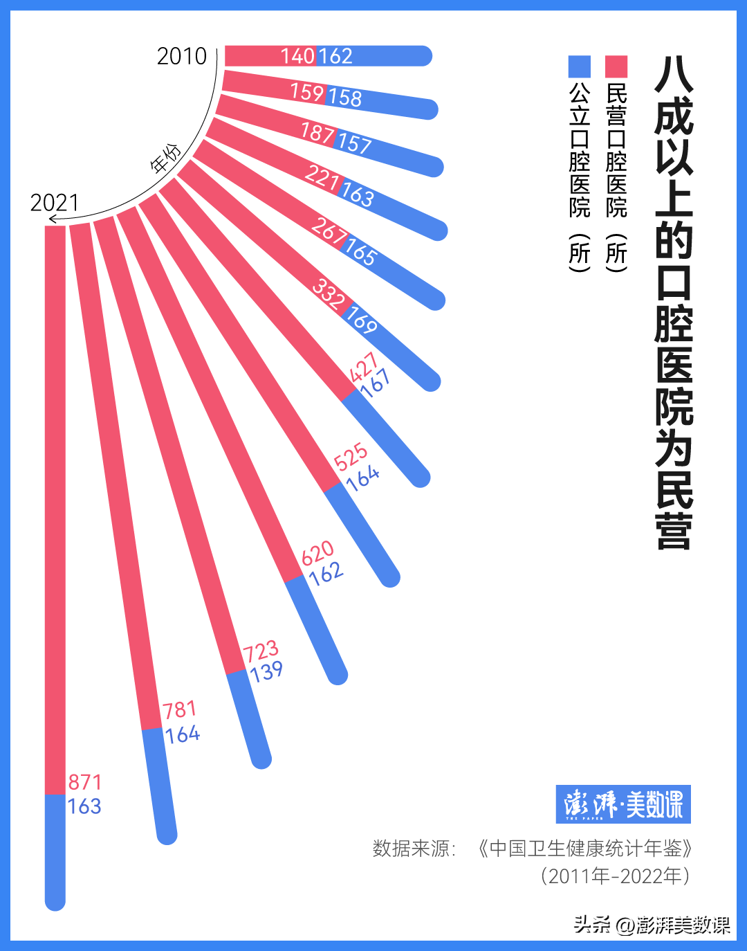 這就不得不提正畸所在的這個領(lǐng)域:口腔科是民營化、市場化高的醫(yī)療行業(yè),且大部分服務(wù)都沒有納入醫(yī)保。根據(jù)《中國衛(wèi)生健康統(tǒng)計年鑒》,中國八成以上的口腔醫(yī)院為民營,這還不包括星羅棋布的私人口腔診所。