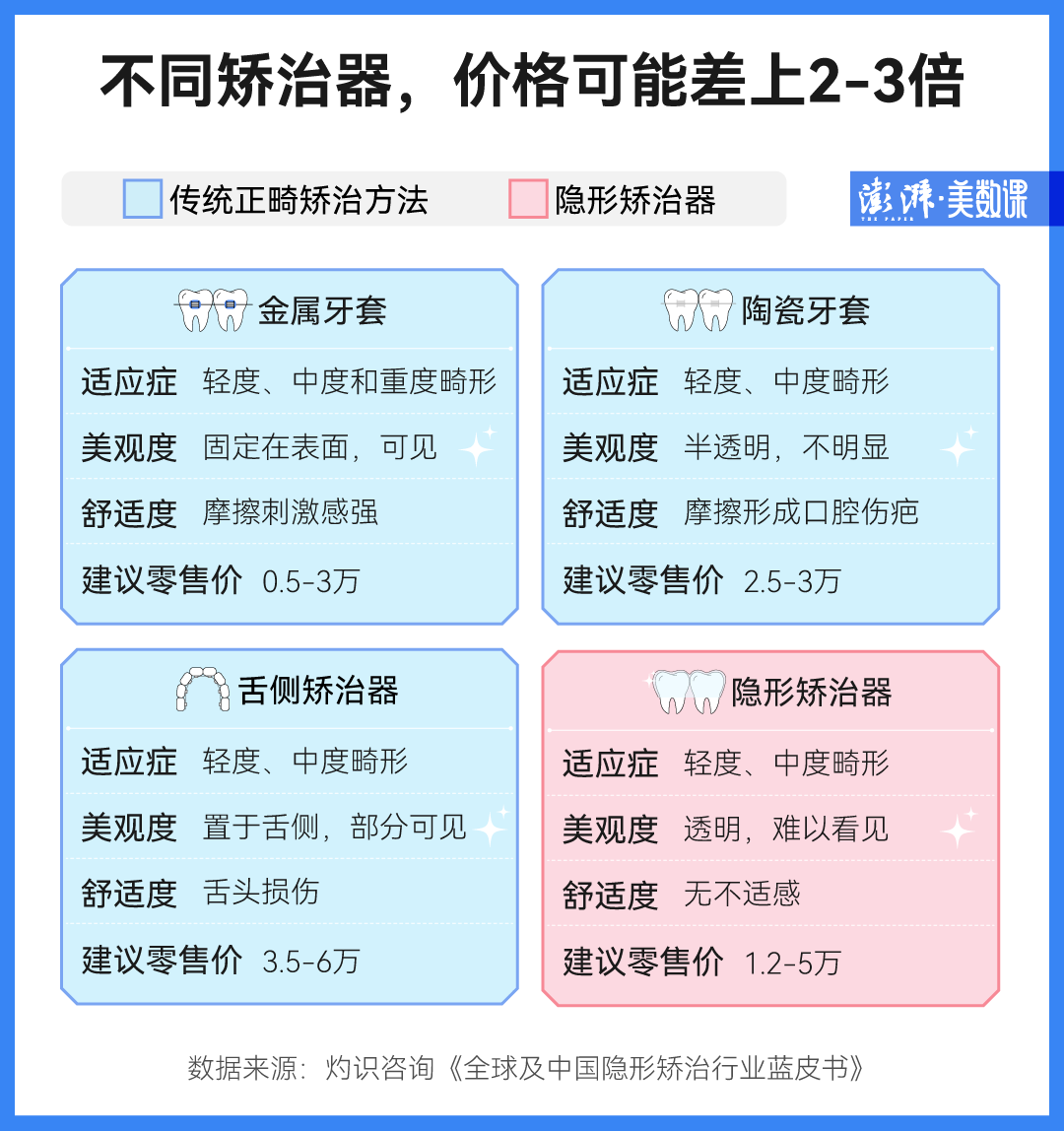 相比于傳統(tǒng)的金屬牙套,隱形正畸因為沒有傳統(tǒng)矯治過程中的鋼絲和托槽,透明不影響牙齒美觀而逐漸受到大家青睞,但售價也高出不少。相比一些國產(chǎn)金屬牙套幾千元的價格,有的進(jìn)口隱形矯治器售價能超過 5 萬元。