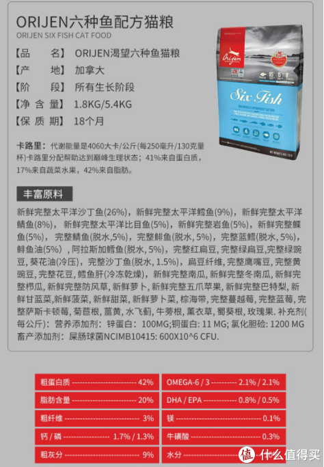 【渴望Orijen六種魚】渴望六種魚,在京東E寵上買過的低價是900元兩袋?,F(xiàn)在已經(jīng)找不到這么低的價格了。六種魚配方如下,可以看得到魚肉含量高達(dá)85%,粗蛋白42%。
