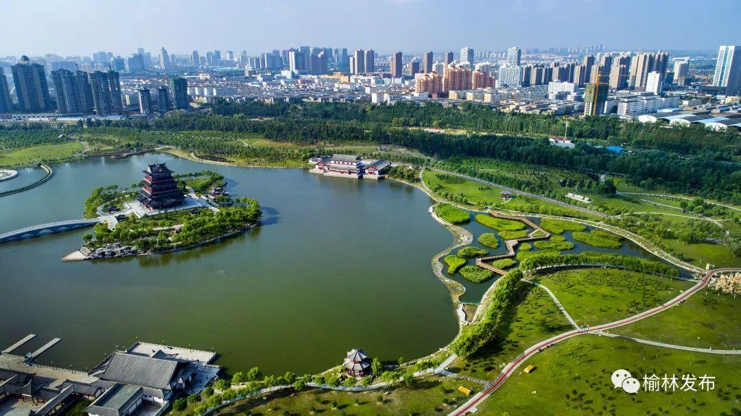 ↑榆林市榆陽區(qū)榆溪河公園(2018年8月2日無人機拍攝)。