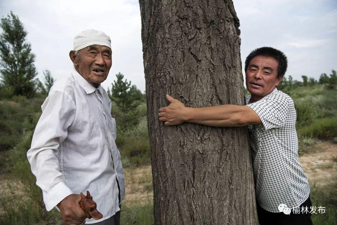 ↑陜西榆林市靖邊縣東坑鎮(zhèn)毛團村年逾九旬的郭成旺(左)的孫兒郭建軍抱著老人1984年栽下的一棵樹,當年的樹苗現(xiàn)已長成參天大樹(2018年7月31日攝)。