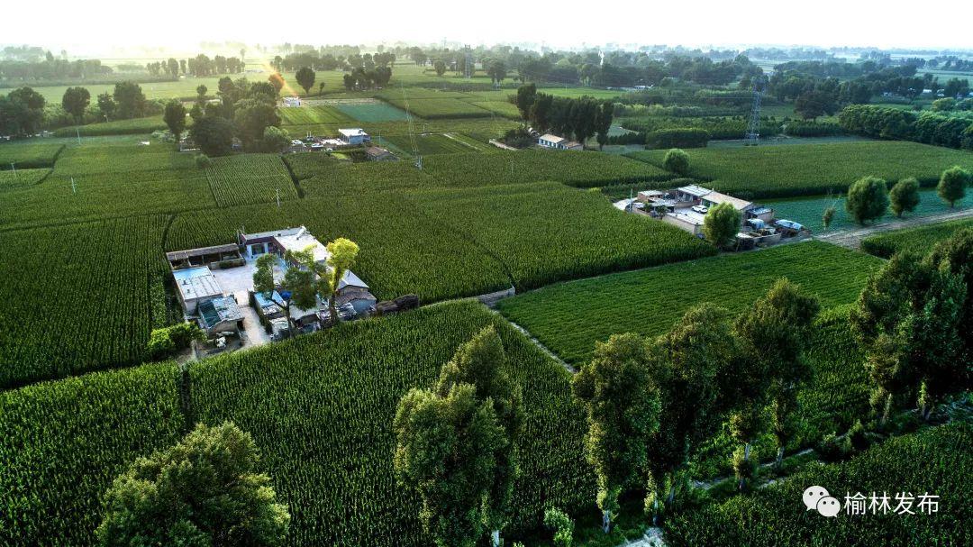 ↑陜西榆林市靖邊縣東坑鎮(zhèn)新建村綠色包圍中的農(nóng)家小院(2018年7月31日無人機拍攝)。