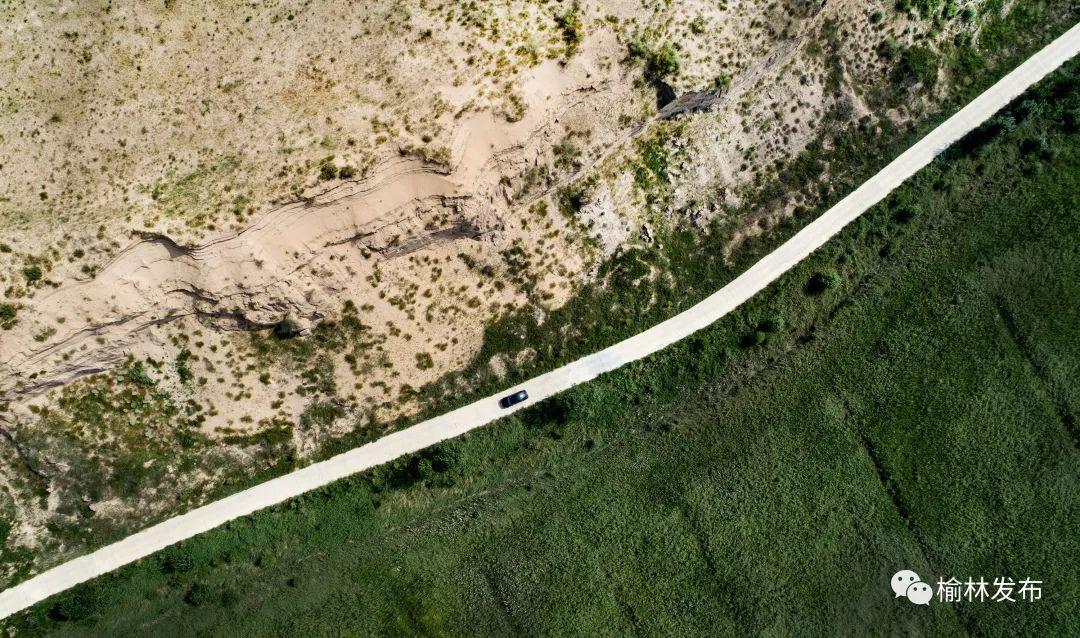 ↑一輛汽車行駛在榆林市橫山區(qū)沙漠治理與未治理的分界公路上(2018年8月4日無人機拍攝)。