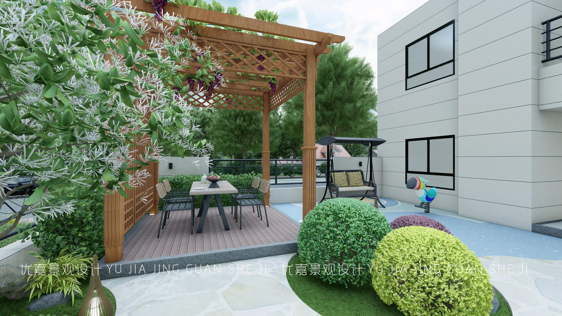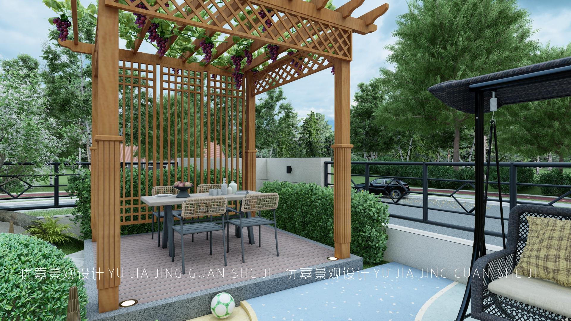 搭建防腐木廊架,擺放餐桌椅可以用來吃飯聊天休息等,坐在廊架內(nèi)的角度剛好可以欣賞到美的景色。