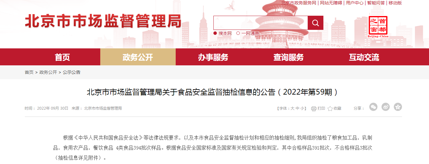 中國(guó)質(zhì)量新聞網(wǎng)訊 9月30日,北京市市場(chǎng)監(jiān)督管理局網(wǎng)站發(fā)布關(guān)于食品監(jiān)督抽檢信息的公告(2022年第59期)。本期抽檢了糧食加工品,乳制品,食用農(nóng)產(chǎn)品,餐飲食品 4類(lèi)食品394批次樣品。根據(jù)食品標(biāo)準(zhǔn)及有關(guān)規(guī)定檢驗(yàn)和判定,其中合格樣品391批次,不合格樣品3批次。