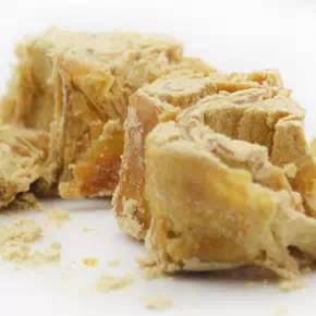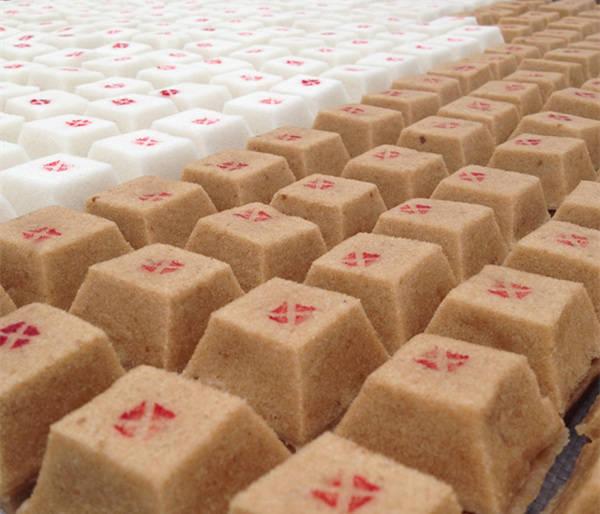 3 制糖:將黃豆粉、熟面粉和糖粉的混合粉用鍋炒熱,取出少量撒在操作臺上,然后放上老糖,表面再撒上熱粉,用搟面杖搟成方形。將熱粉放入其中,再將老糖兩面相互對折,用搟杖搟薄,然后再放熱粉,如此重復折疊三次,后用手捏成長條,順直,切成四方小塊,然后用木條擠緊壓實。