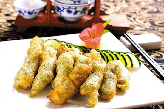 “苔拖黃魚”也叫“苔菜拖黃魚”,是寧波地方的傳統(tǒng)名菜。由于寧波靠海,故周圍盛產(chǎn)苔菜。苔菜,又名苔條。