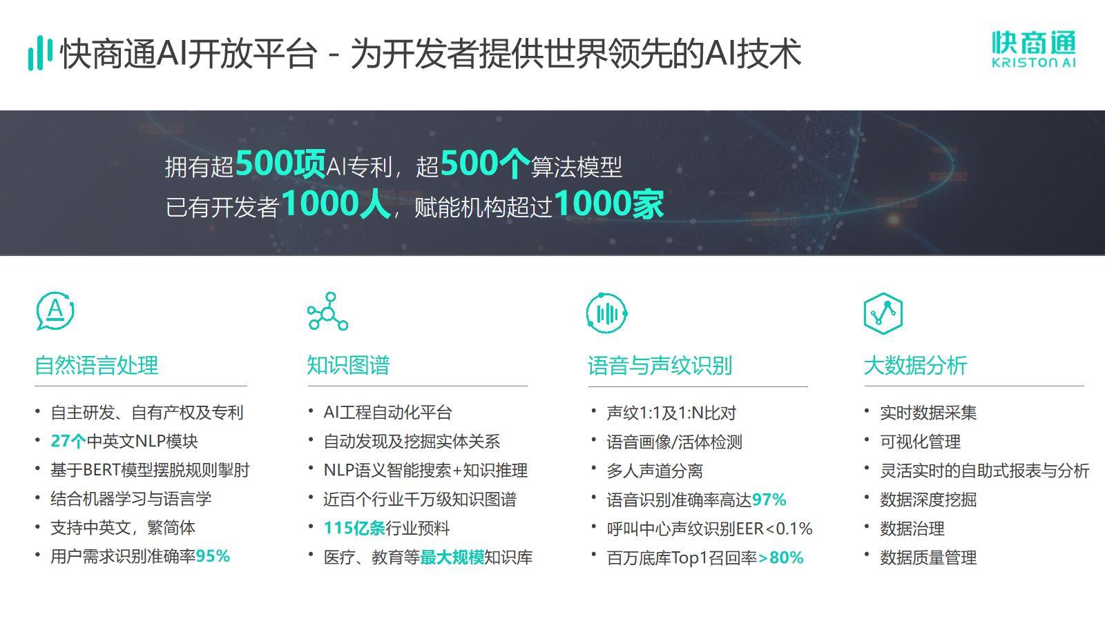 快商通作為批布局人工智能的企業(yè),始終奮斗在科技創(chuàng)新一線,深刻體會(huì)到科技競(jìng)爭(zhēng)愈加激烈,科技自立自強(qiáng)對(duì)于和民族具有重要意義。在布局AI的13年中,快商通重視底層算法自研,匯集了一支由斯坦福大學(xué)、劍橋大學(xué)、新加坡國(guó)立大學(xué)、清華大學(xué)等國(guó)內(nèi)外學(xué)府成員組成的科研團(tuán)隊(duì),通過(guò)自然語(yǔ)言處理(NLP)、知識(shí)圖譜(KG)、語(yǔ)音識(shí)別(ASR)、聲紋識(shí)別(VPR)四大核心技術(shù)創(chuàng)新實(shí)現(xiàn)卓越績(jī),擁有超500項(xiàng)AI專利,發(fā)布超600篇論文,與廈門(mén)大學(xué)、華僑大學(xué)等院校開(kāi)展緊密的產(chǎn)學(xué)研合作,以“產(chǎn)學(xué)研一體化”為依托,持續(xù)保持的技術(shù)創(chuàng)新水平,增強(qiáng)快商通在人工智能領(lǐng)域的話語(yǔ)權(quán)與主導(dǎo)權(quán)。