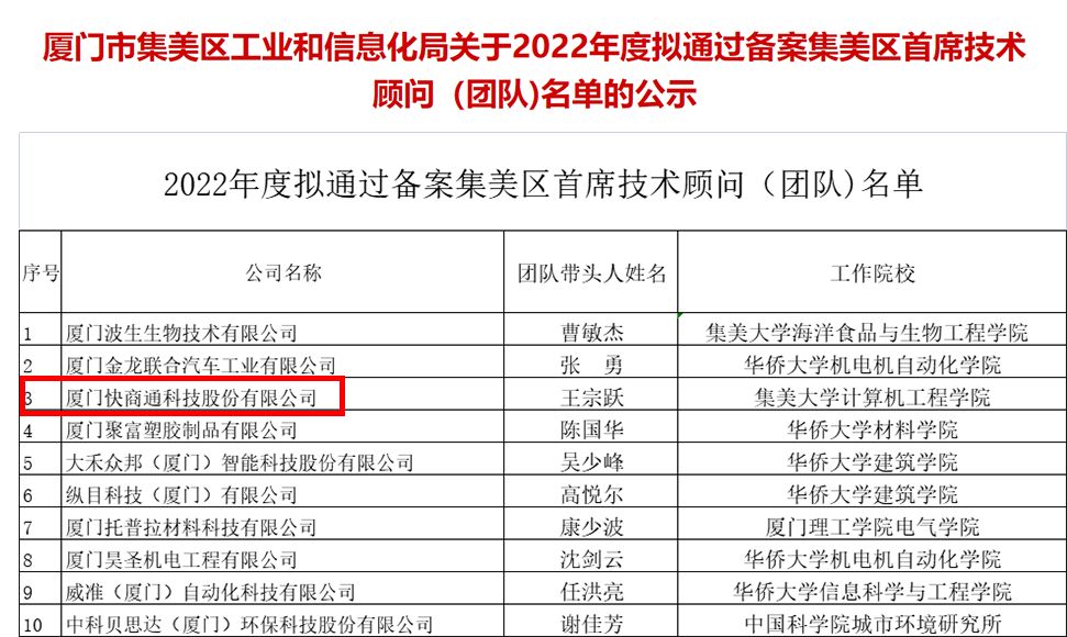近日,廈門(mén)市集美區(qū)工業(yè)和信息化局關(guān)于2022年度擬通過(guò)備案集美區(qū)技術(shù)顧問(wèn)(團(tuán)隊(duì))名單全網(wǎng)公示。經(jīng)過(guò)征求“集美區(qū)高校產(chǎn)業(yè)技術(shù)聯(lián)盟”意見(jiàn),并對(duì)企業(yè)的相關(guān)資質(zhì)、研發(fā)投入及經(jīng)濟(jì)貢獻(xiàn)等方面進(jìn)行綜合考量,快商通技術(shù)團(tuán)隊(duì)成功入選“廈門(mén)市集美區(qū)技術(shù)顧問(wèn)(團(tuán)隊(duì))”!