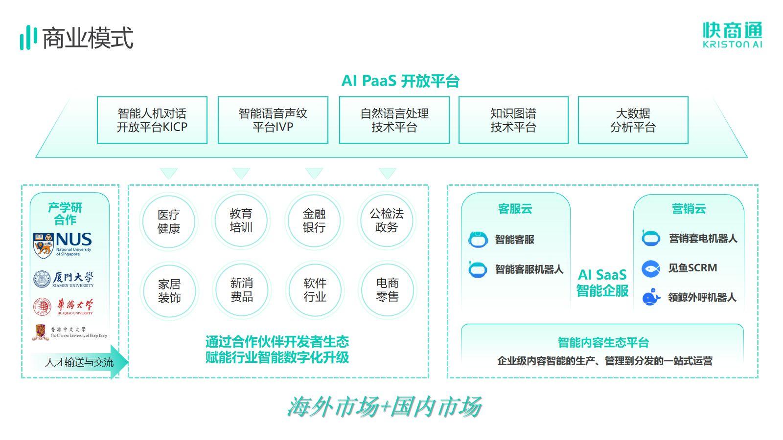 基于自主研發(fā)核心能力,快商通搭建AI PaaS開(kāi)放平臺(tái),以AI PaaS平臺(tái)為依托開(kāi)發(fā)了AI SaaS 智能企服產(chǎn)品體系,同時(shí)扶持有需求、有想法、有創(chuàng)新的開(kāi)發(fā)者們對(duì)技術(shù)進(jìn)行調(diào)用,推動(dòng)人工智能與產(chǎn)業(yè)深度融合發(fā)展。AI SaaS 智能企服產(chǎn)品體系,主要賦能于醫(yī)療醫(yī)美、教育、家居等企業(yè)機(jī)構(gòu),基于對(duì)話式AI能力,提供流量、AI+SaaS工具、運(yùn)營(yíng)服務(wù)三位一體的全鏈路解決方案,幫助企業(yè)實(shí)現(xiàn)全域流量的營(yíng)銷(xiāo)、流量資源的整合拓展、提升品牌營(yíng)銷(xiāo)率、助力私域高變現(xiàn)、拓寬企業(yè)的增長(zhǎng)邊界。目前快商通AI SaaS全鏈路營(yíng)銷(xiāo)解決方案已經(jīng)擁有邦泰集團(tuán)、登特口腔、雍禾植發(fā)、歐派家居、新華教育等重要合作伙伴,積累了38萬(wàn)+客戶資源,在數(shù)字技術(shù)及應(yīng)用方面具有深厚的技術(shù)積累和行業(yè)沉淀。