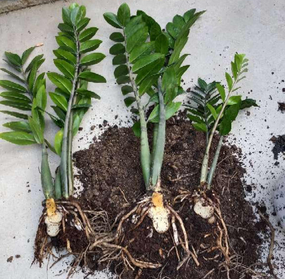 金錢樹根系很粗,還有“土豆”根,拆分的時候要小心,留好土豆根,分株的時候可以切開,切開的話要泡多菌靈半小時殺菌,然后晾一夜,第二天上盆。