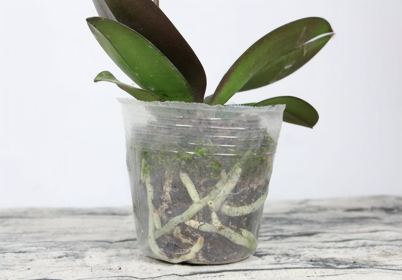 蝴蝶蘭大多帶著一個透明塑料缽,可以透過它觀察根系和水苔,有發(fā)黑、黑色的、味道發(fā)臭的、根系太多裝不下的,就要更換新水苔咯。
