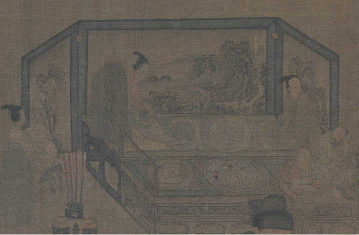 同樣,屏風(fēng)畫里白居易的《偶眠》詩意,也是用一連串的道具和仆人的活動,聯(lián)想主人公白衣隱士的一系列情節(jié):前面:書案上擺放著的卷冊和茶壺、茶碗,可知主人公此前曾啜茗讀書;中間:白衣隱士的夫人正在幫他脫去紗帽;后面:兩個女仆在鋪床,一個女仆抱來被褥,將要發(fā)生的情節(jié)是白衣居士要在這里進(jìn)入夢鄉(xiāng)。三個情節(jié)發(fā)生的位置分別是前、中、后,將空間引向縱深的屏風(fēng)山水,與李璟等四人擺棋子的情節(jié)發(fā)生的位置左、中、右相交錯。李璟等四人的活動與屏中畫的情節(jié)均表現(xiàn)出,人物的活動都發(fā)生在這個時間過程的中間段,兩者的繪畫構(gòu)思呼應(yīng)得十分得體。一千多年前的畫家有如此匠心,令人欽佩。這無疑是周文矩為李煜朝顧閎中畫《韓熙載夜宴圖》做出的的藝術(shù)鋪墊。