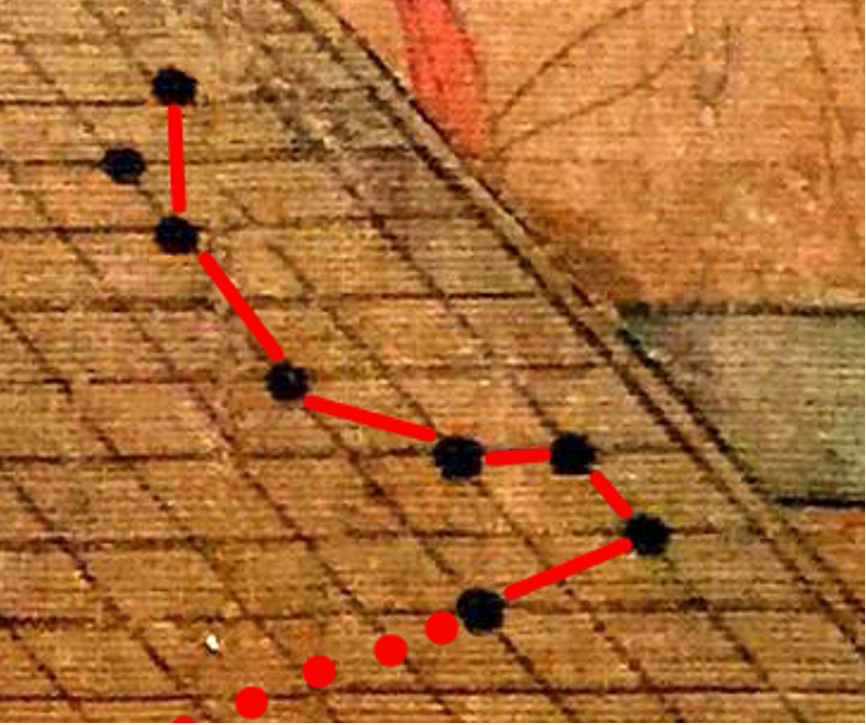細(xì)細(xì)查看棋盤:景達(dá)執(zhí)白,景逿執(zhí)黑。他在左下角用一個黑子為星位座子,在對角又用另一個黑子為星位座子,另六個黑子擺出了一個長蛇陣的組合。圍棋常識告知我們,這個“會棋”不會是棋局。我懷疑他是在擺一幅《天象圖》。我經(jīng)過多方請教圍棋高手和懂星象的朋友,這是一個不標(biāo)準(zhǔn)的北斗七星。哪兒不標(biāo)準(zhǔn)呢?差一個子兒嘛!那個子在哪里呢?我找啊找,在景逿的食指和中指間夾著一枚黑子,兩個手指正伸向六星之首,刨去占位的黑子,這正是地地道道的北斗七星,七星之首天樞星所面向左下方守角的那枚黑子就是北極星。從勺緣到勺柄尾端共計七顆星,即天樞、天璇、天璣、天權(quán)、玉衡、開陽、搖光,古希臘文字母依次是α、β、γ、δ、ε、ζ、η,聯(lián)接天璇星β和天樞星α的線延長大約5倍處,可以尋找到北極星。故天璇β星和天樞α星又叫“指極星”。北極星在古代亦被稱為紫薇星,是蒼穹中的高星位,故將它稱為“帝星”,北斗七星圍繞著北極星運轉(zhuǎn)。[圖4-8]畫中的李璟手執(zhí)記譜冊,看得出,他對這個“棋局”的發(fā)展是滿意的,他要將這個布局記錄下來。