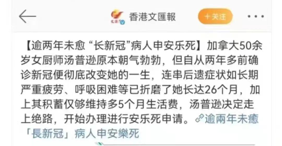 加拿大一名50歲的女廚師,在兩年前感染新冠后,受后遺癥折磨長達(dá)26個(gè)月,多年積蓄被醫(yī)療費(fèi)耗盡,申請了這項(xiàng)“服務(wù)”。