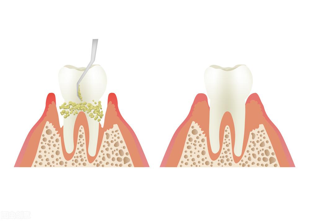 有牙結(jié)石的牙齒(左)會(huì)形成牙周袋,造成牙齦萎縮