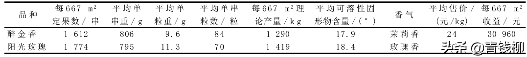 由表3可知,“醉金香”果穗特大,平均單串重為 806 g,大可達1 300 g,平均單粒重為 9.6g,大單粒重為13 g,理論產(chǎn)量較高,每 667 m 2達1 290 kg,果肉軟、汁多,有茉莉香味,平均可溶性固形物含量為17.9°,每667 m 2 收益達30 960元;“陽光玫瑰”果穗大,平均單串重為798 g,大可達 1 100 g,平均單粒重為 11.3 g,大單粒重為 15 g,理論產(chǎn)量高,每 667 m 2 達 1 419 kg,果肉硬脆,無澀味,有玫瑰香味,平均可溶性固形物含量為 18.4°,每 667 m 2 收益達 70 950 元。