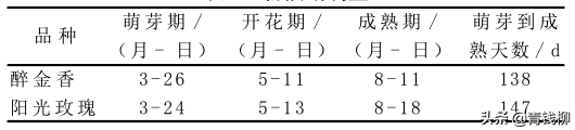 由表 1可知,“醉金香”從萌芽至成熟約需138d,“陽光玫瑰”從萌芽至成熟約需 147 d。