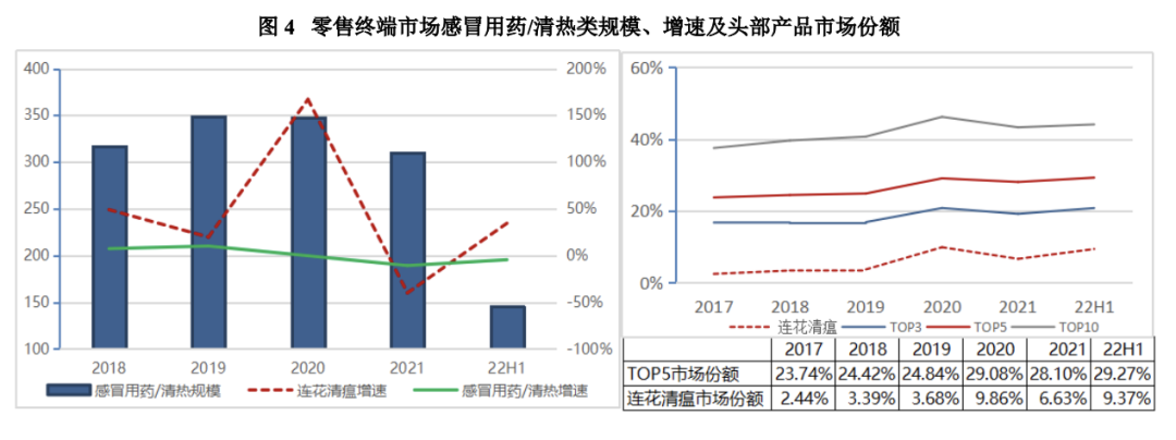 今年來,以嶺藥業(yè)旗下連花清瘟產(chǎn)品的市場(chǎng)份額逐年攀升,2022年半年報(bào)顯示,2017年至2022年上半年其連花清瘟產(chǎn)品市場(chǎng)份額由2.44%增至9.37%,位列第一。