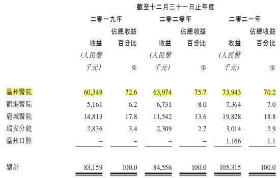 截至目前,中國口腔醫(yī)療擁有及運營5家位于溫州的民營牙科醫(yī)院,分別為溫州醫(yī)院、鹿城醫(yī)院、溫州口腔、瑞安分院、龍港醫(yī)院。其中溫州醫(yī)院2019-2021年(以下簡稱“報告期”)的收益分別為6034.9萬元、6397.4萬元、7394.3萬元,占營業(yè)收入的比例分別為72.6%、75.7%、70.2%;龍港醫(yī)院報告期內(nèi)的營業(yè)收入分別為516.1萬元、673.1萬元、736.4萬元,分別占比6.2%、8.0%、7.0%;鹿城醫(yī)院的報告期內(nèi)營業(yè)收入分別為1481.3萬元、1154.2萬元、1982.8萬元,分別占比17.8%、13.6%、18.8%;瑞安分院報告期內(nèi)營業(yè)收入分別為283.6萬元、230.9萬元、301.4萬元,分別占比3.4%、2.7%、2.9%;溫州口腔2021年開始運營,去年實現(xiàn)收益116.6萬元,占比1.1%。