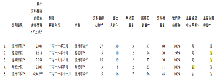 龍港醫(yī)院成立于2015年8月,2016年10月開始運營;鹿城醫(yī)院成立于2016年6月,2017年6月開始運營;瑞安分院成立于2017年11月,2018年4月開始運營。中國口腔醫(yī)療此前曾在招股書中表示,“開辦新的牙科醫(yī)院通常大約需要四年方能達到收支平衡,約需要七年才能收回初始投資?!边@也意味著,龍港醫(yī)院和鹿城醫(yī)院即將到達收回初始投資期,瑞安分院即將到達收支平衡期,但據(jù)其招股書披露,龍港醫(yī)院和鹿城醫(yī)院尚未收回初始投資,瑞安分院也尚未實現(xiàn)收支平衡。
