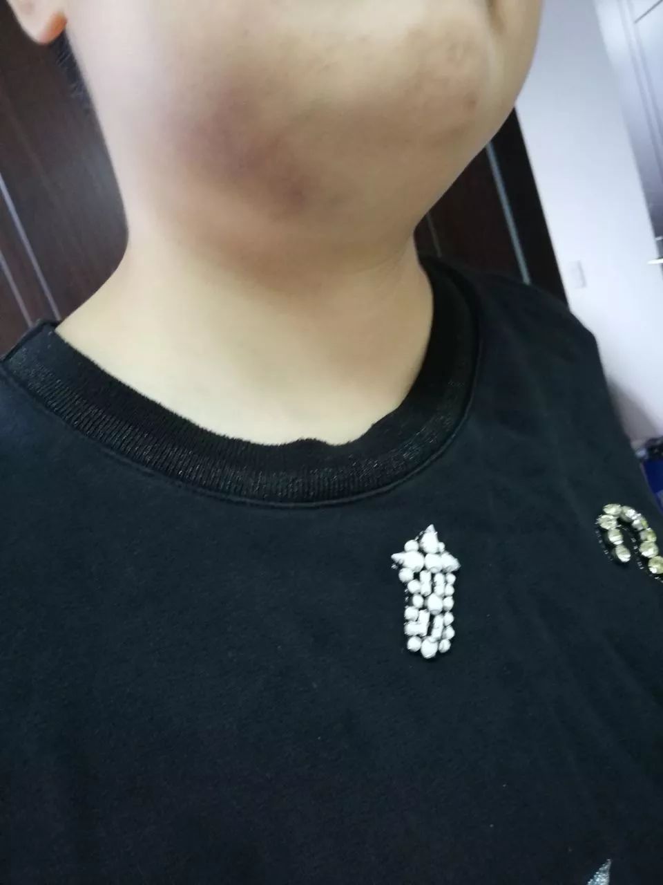 后附上今天下午拍的圖三:是我今天拍的下巴,腫還沒(méi)消,這下巴烏青的……前兩天臉歪嘴歪的都張不開(kāi)。