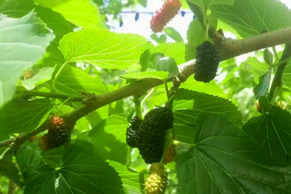 當前,蝶兒桑葚采摘園10余畝的桑葚已經(jīng)進入成熟期,綠葉蔥蘢間,紫黑的顏色瞬間勾起童年的記憶,一把一把吃的痛快,以及紫黑色的指甲和牙齒,喜歡得緊又討厭得很。