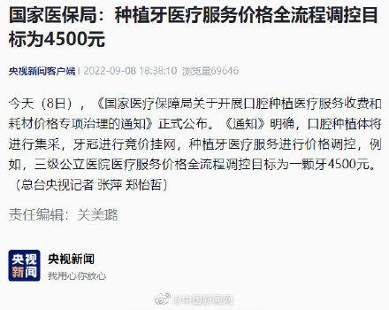 今天(8日),《醫(yī)療保障局關(guān)于開展口腔種植醫(yī)療服務(wù)收費(fèi)和耗材價(jià)格專項(xiàng)治理的通知》正式公布?!锻ㄖ访鞔_,口腔種植體將進(jìn)行集采,牙冠進(jìn)行競(jìng)價(jià)掛網(wǎng),種植牙醫(yī)療服務(wù)進(jìn)行價(jià)格調(diào)控,例如,三級(jí)公立醫(yī)院醫(yī)療服務(wù)價(jià)格全流程調(diào)控目標(biāo)為一顆牙4500元。(新聞客戶端)