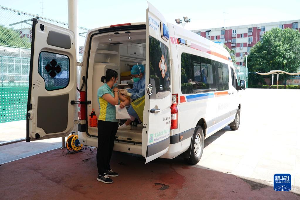 2022年7月13日,在北京市海淀區(qū)北下關(guān)街道中國農(nóng)業(yè)科學院社區(qū)新冠疫苗臨時接種點,醫(yī)護人員在流動疫苗接種車上為社區(qū)居民接種。新華社記者任超 攝