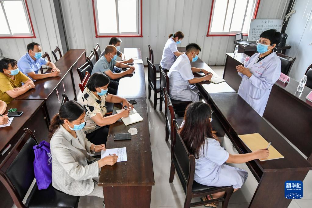 2022年7月6日,長治醫(yī)學院和平醫(yī)療集團“第一村醫(yī)”壺關(guān)縣工作隊的醫(yī)生趙甘婷(右一)在為山西省長治市壺關(guān)縣大峽谷鎮(zhèn)衛(wèi)生院的村醫(yī)們上課。新華社記者曹陽 攝