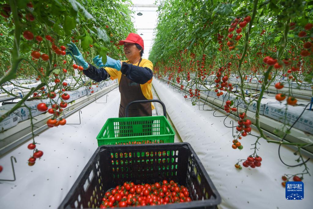 2022年5月31日,在浙江省嘉興市南湖區(qū)七星街道湘家蕩農(nóng)業(yè)數(shù)字化工廠的數(shù)字化大棚內(nèi),農(nóng)民在采摘立體栽培的番茄。新華社記者徐昱 攝