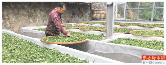 大雨初歇,滿山青翠。茶場主人朋伯帶領(lǐng)南都記者參觀茶場里的茶廠。雖然條件簡單,但茶廠的設(shè)備一應(yīng)俱全。朋伯說,茶場與廣東科貿(mào)職業(yè)學(xué)院長期合作,學(xué)校每年安排茶藝專業(yè)學(xué)生來此實習(xí)。此時在茶廠正有一名女生林月春,主要負(fù)責(zé)茶葉揉捻、干燥工序。走水、萎凋、揉捻、悶黃、發(fā)酵、干燥,制作白云紅茶、黃茶的工序有很大區(qū)別,使用機器也不盡相同。紅茶干燥三次,每一次的溫度不同。林月春和朋伯將茶葉在竹篾團上攤薄,再放入機器中進(jìn)行干燥處理。溫度是110攝氏度。