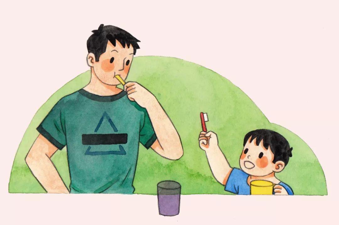 爸爸媽媽可以在自己刷牙的時候也給孩子一個牙刷,