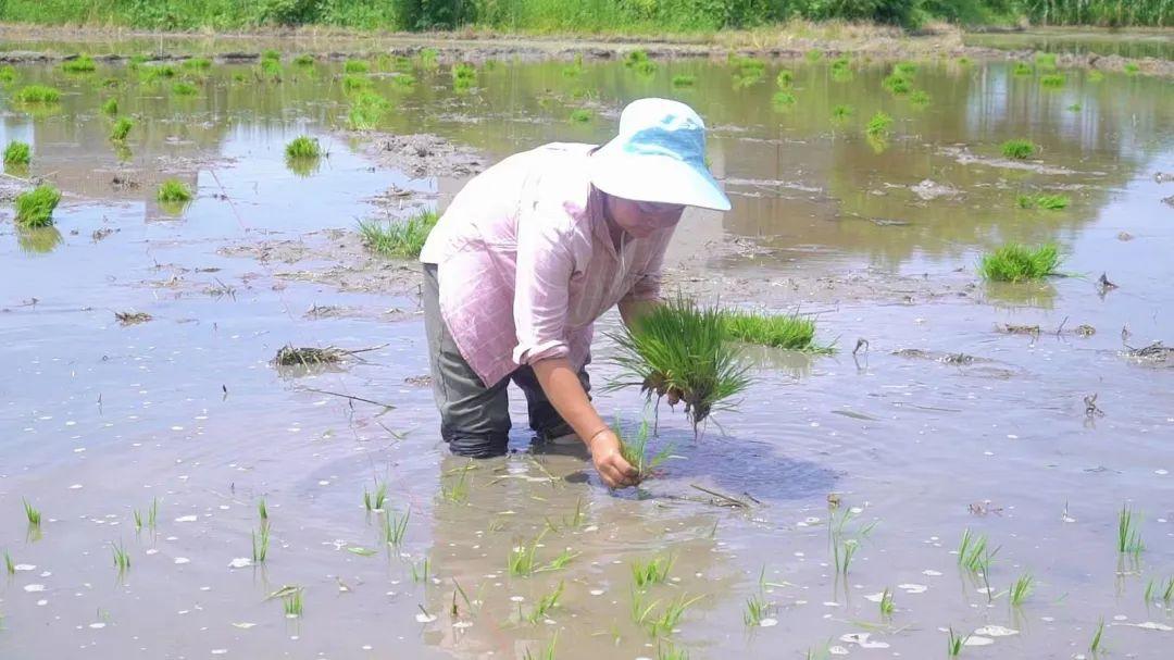 7月14日一早,臨澧縣新安鎮(zhèn)李家溶村,鄧桂香已經(jīng)在田里和工人們一起忙碌了很久,她五點鐘就起了床,帶領(lǐng)著雇傭的工人們一起下田,安排好每個人要干的活,自己也挽起褲腿踩在水田里,左手拿著一大捧嫩綠的秧苗,右手麻利地將一小撮一小撮的秧苗插進水田。她戴著一頂淺藍色的遮陽帽,即使這樣圓圓的臉也被曬得通紅,豆大的汗珠從臉頰上淌下來,濕漉漉的泥土掛滿了她的小腿。