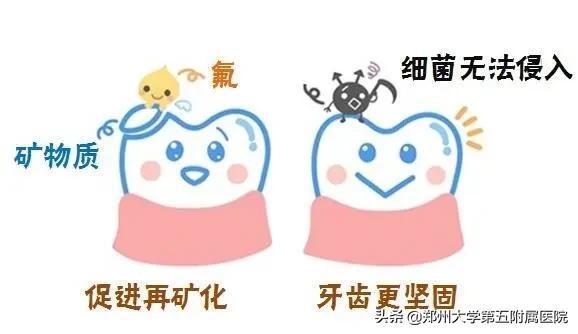 氟在預(yù)防齲病方面起到重要作用,可以抑制牙齒硬組織的溶解(脫礦),促進(jìn)牙齒再礦化,還能抑制細(xì)菌生長(zhǎng)。