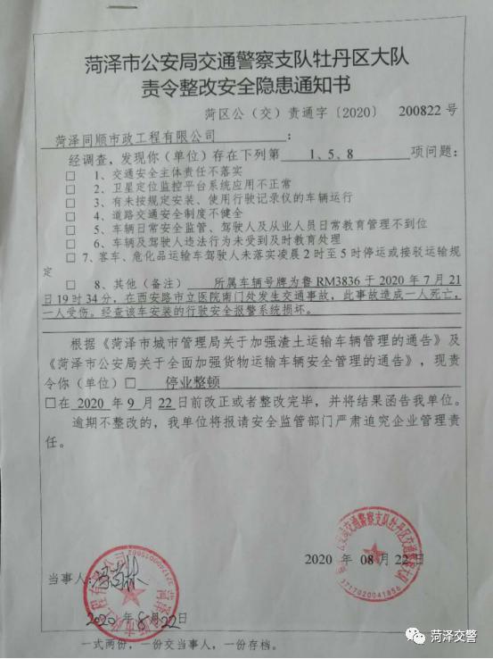 8月22日,菏澤市交通警察支隊牡丹區(qū)大隊約談菏澤同順市政工程有限公司負責人,強調駕駛的重要性,要求公司落實主體責任主體,加強交通知識培訓工作,并對肇事車輛魯RM3836號渣土運輸貨車在行駛報警系統(tǒng)損壞的情況下依然從事貨物運輸行為提出整改意見。要求菏澤同順市政工程有限公司舉一反三杜絕類似問題再次發(fā)生,約談會當場向菏澤同順市政工程有限公司下達責令整改隱患通知書責令同順市政工程有限公司停業(yè)整頓。
