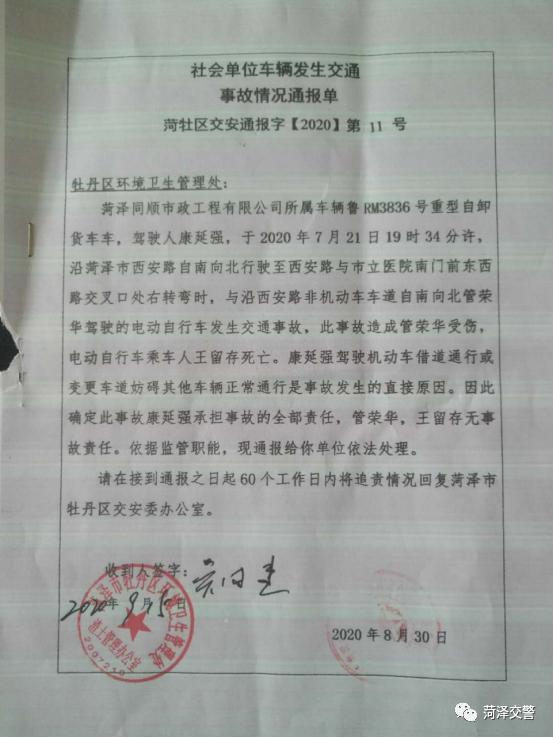 菏澤市交通警察支隊牡丹區(qū)大隊及時將該事故調查情況上報菏澤市牡丹區(qū)交安委,要求相關主管部門對同順市政工程有限公司監(jiān)管職責執(zhí)行不到位的問題作出處理,9月15日牡丹區(qū)交安委向牡丹區(qū)環(huán)境衛(wèi)生管理處下達社會單位車輛發(fā)生交通事故情況通報單要求牡丹區(qū)環(huán)境衛(wèi)生管理部門對同順市政工程有限公司相關調查處理工作。