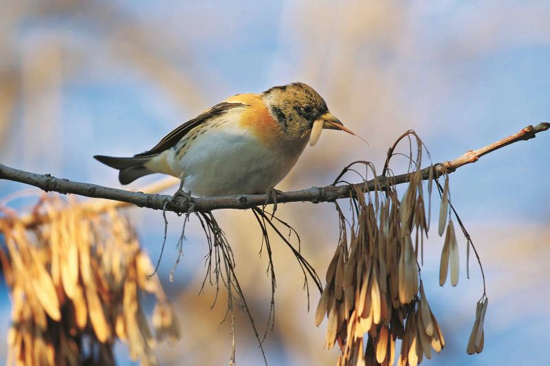 燕雀的喙比較小巧,它們會先跳到掛著滿滿果實(shí)的枝條上,挑選出一個果實(shí),然后用輕巧的喙將翅咬斷,再將種子掉個頭,像嗑瓜子一般將果殼磕開,把種子取出來吃掉。而蠟嘴雀和錫嘴雀的喙則相當(dāng)厚實(shí),一口一個,嗑翅果種子的外殼簡直不費(fèi)吹灰之力。