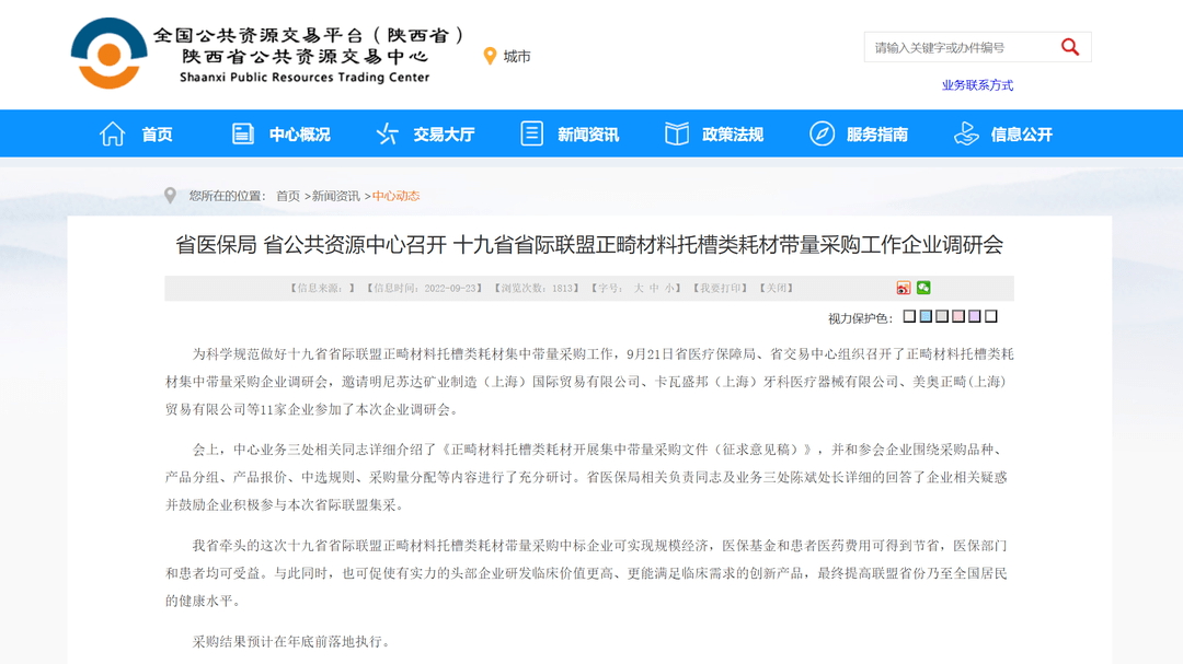 9月30日,四川省藥械集中采購(gòu)平臺(tái)發(fā)布《口腔種植體系統(tǒng)省際聯(lián)盟集中帶量采購(gòu)辦公室關(guān)于口腔種植體系統(tǒng)集中帶量采購(gòu)產(chǎn)品新增及系統(tǒng)組合工作延期的補(bǔ)充公告》,再次開展基礎(chǔ)信息增補(bǔ)工作。據(jù)了解,此次開展企業(yè)調(diào)研會(huì)是為十九省省際聯(lián)盟正畸材料托槽類耗材集中帶量采購(gòu)做準(zhǔn)備。相關(guān)負(fù)責(zé)人在會(huì)議上詳細(xì)介紹了《正畸材料托槽類耗材開展集中帶量采購(gòu)文件(征求意見稿)》,并和參會(huì)企業(yè)圍繞采購(gòu)品種、產(chǎn)品分組、產(chǎn)品報(bào)價(jià)、中選規(guī)則、采購(gòu)量分配等內(nèi)容進(jìn)行研討,鼓勵(lì)企業(yè)積極參與本次省際聯(lián)盟集采。