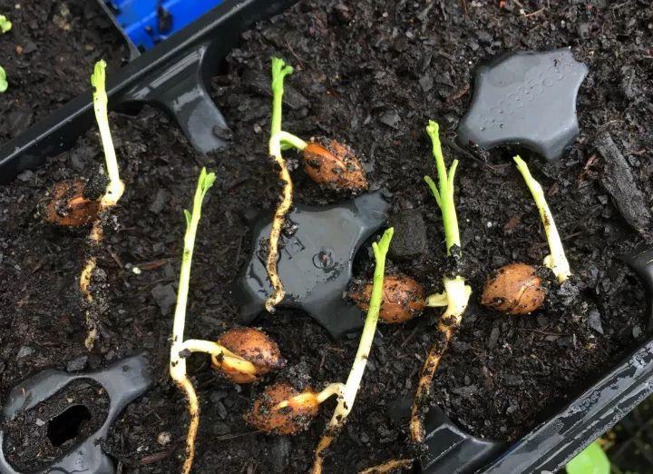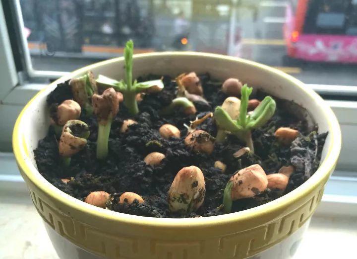 花生出芽后可以栽盆里啦,把帶芽的那頭塞進(jìn)土里,露出一半花生米就行了,放在窗臺上每天噴噴水,很快就能張開小手,變成小苗。