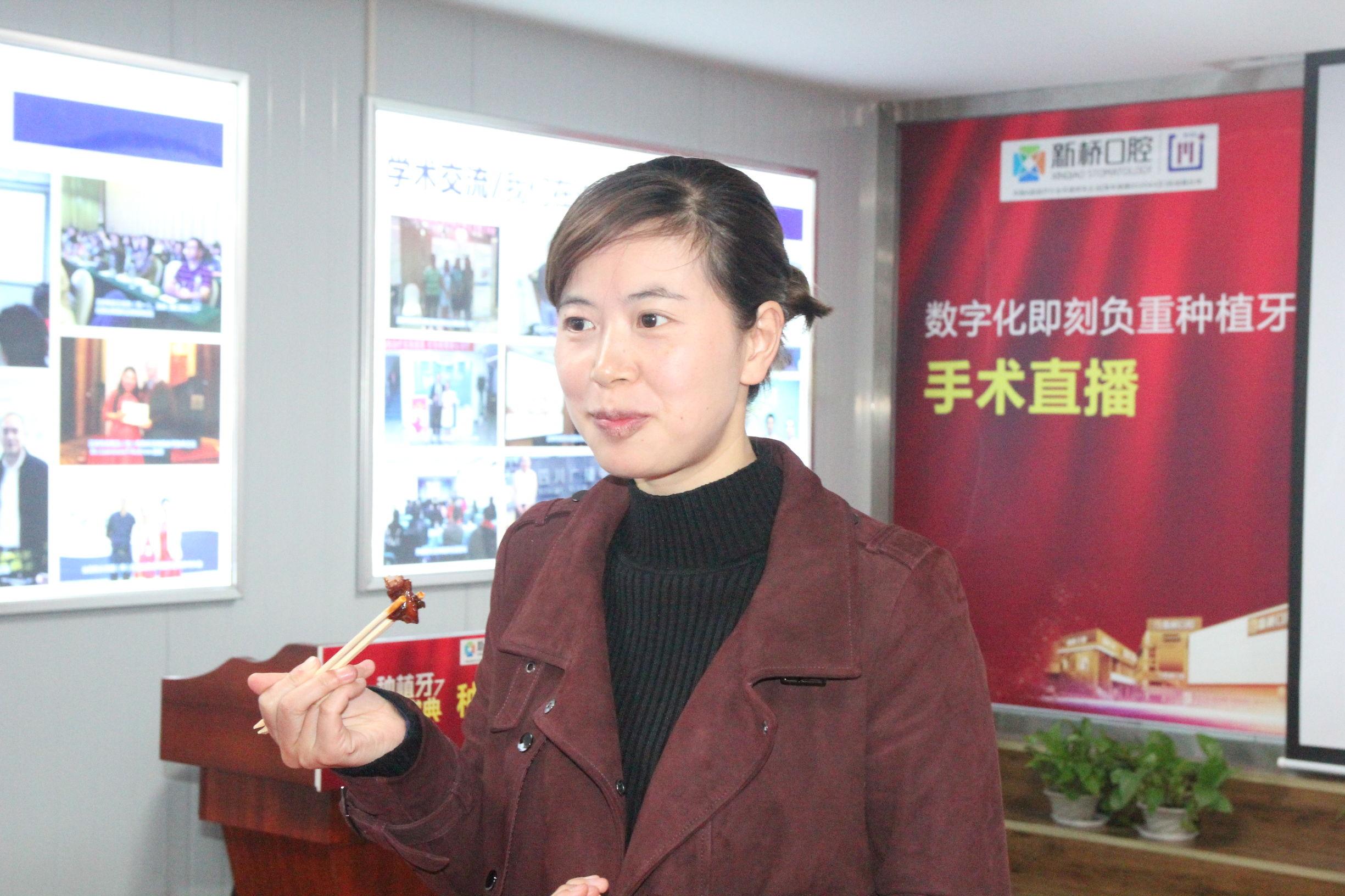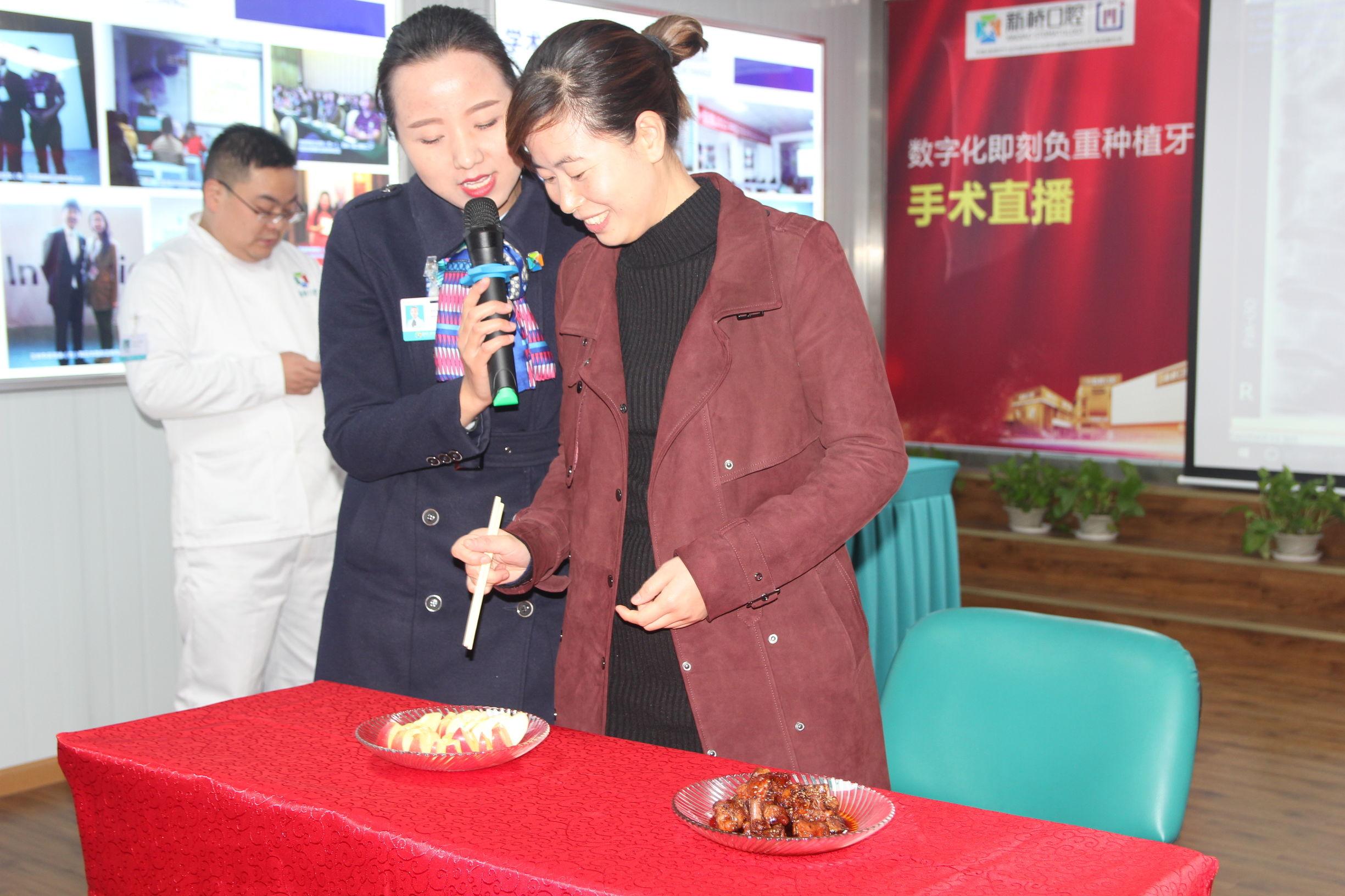 在活動(dòng)開(kāi)始前,新橋口腔就“夸下??凇保Q種完牙可以立刻吃排骨。手術(shù)結(jié)束后,馮女士和王旭東醫(yī)生再次來(lái)到直播現(xiàn)場(chǎng),現(xiàn)場(chǎng)挑戰(zhàn)負(fù)重種植牙的咀嚼力。