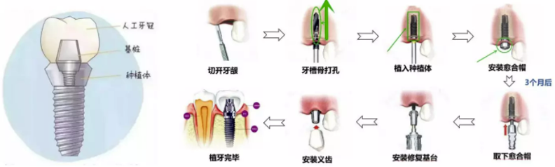 其中種植牙可以理解為先切開(kāi)牙齦,把牙槽骨打好孔后植入人工種植體充當(dāng)牙根。待幾個(gè)月后種植體和牙組織結(jié)合好了,再安裝種植體上面的基臺(tái)和牙冠(義齒),也就是實(shí)際露出的部分。因?yàn)榉N植牙不需要磨損旁邊的好牙,在牙齦受力性等生理結(jié)構(gòu)上也與真牙接近,所以是能患者生活質(zhì)量的調(diào)節(jié)方式。