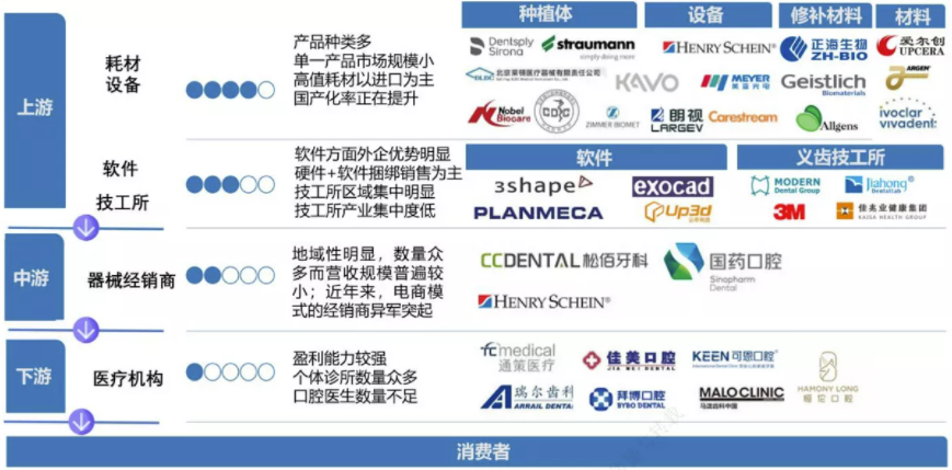 不過(guò)種植牙的費(fèi)用也遠(yuǎn)比前兩者高,這和種植牙行業(yè)上下游的市場(chǎng)格局有直接關(guān)系。